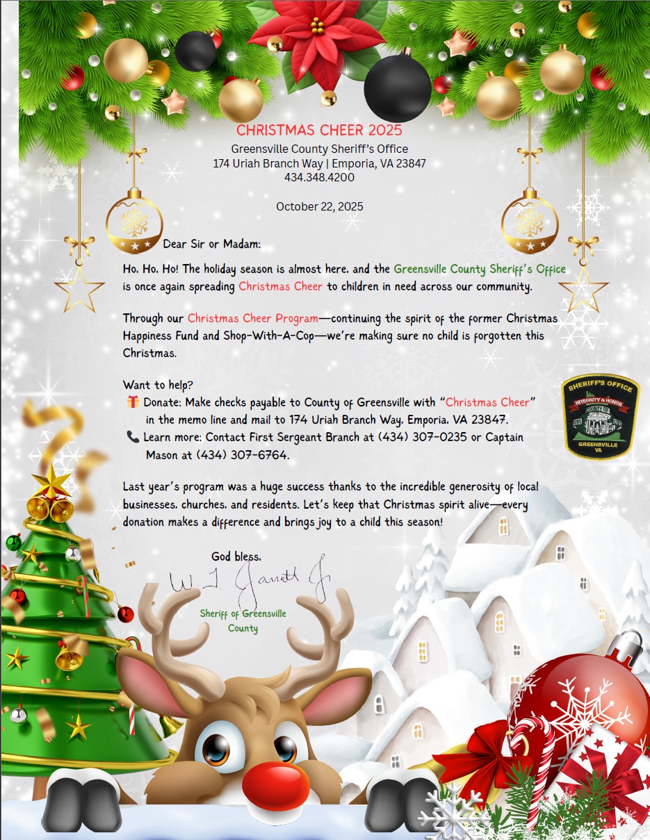 The Greensville County Sheriff's Office hosts an annual Christmas Cheer program. This program is a way to give back to the community in which we serve. The Christmas Cheer program helps building relationships with the community and children to help build the bridge in the gaps with the community. Christmas Cheer applications can be obtained by downloading the below PDF form. Applications can also be picked up and returned to the Sheriff's Office 24 hours a day. Also, you may ask any Deputy you see for an application.